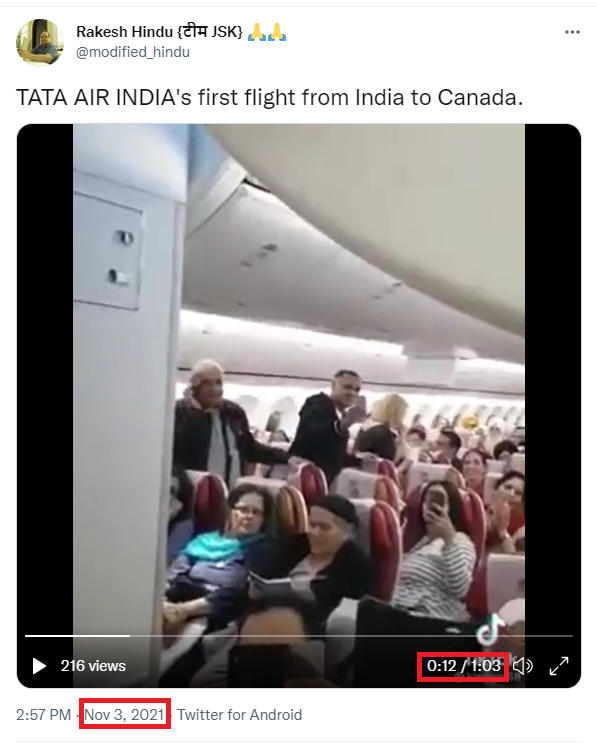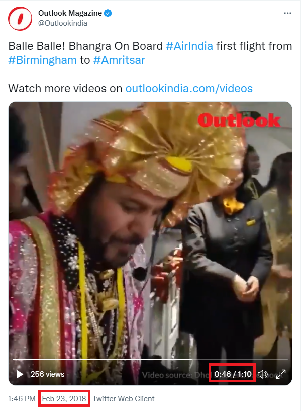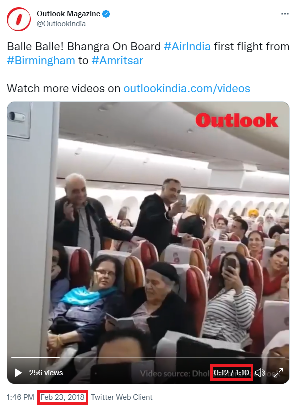 To check if the viral video is from the “Tata group’s first flight” after the reacquisition, Newchecker ran a keyword search for “bhangra flight” on Twitter and found a Tweet by the Outlook magazine dated February 23, 2018.