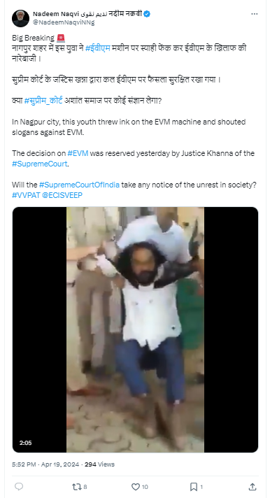 A video of a man throwing ink on an EVM inside a polling booth has surfaced on social media platforms following the polling for the first phase of Lok Sabha Elections. In the video, the man can be heard sloganeering against the EVM system for voting as police personnel drag him out of the polling booth. Multiple social media users shared the video claiming to show an incident during the voting in Nagpur constituency, which went to polls on April 19. Newschecker found the claim to be untrue. The video dates back to 2019, and shows an incident from Thane.