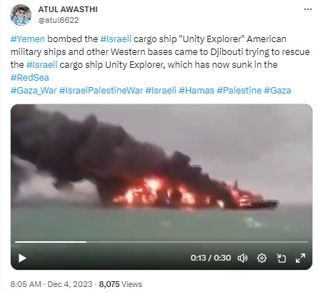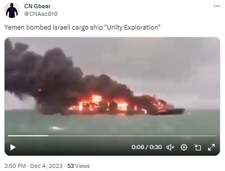 Yemen bombs Israeli cargo ship ‘Unity Explorer’ amid the Israel-Hamas conflict.