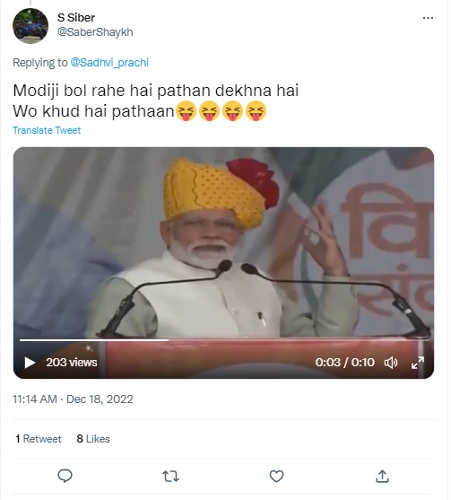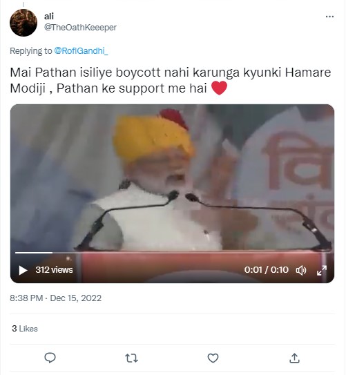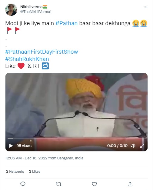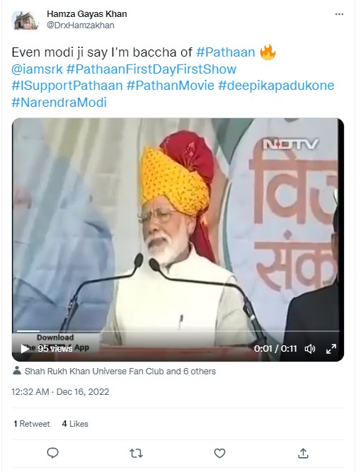 The 10-second-long-clip is going viral on Twitter with many sharing it to show support to the movie Pathan. Several users also cited PM Modi calling himself a Pathan as reason enough to watch the film.