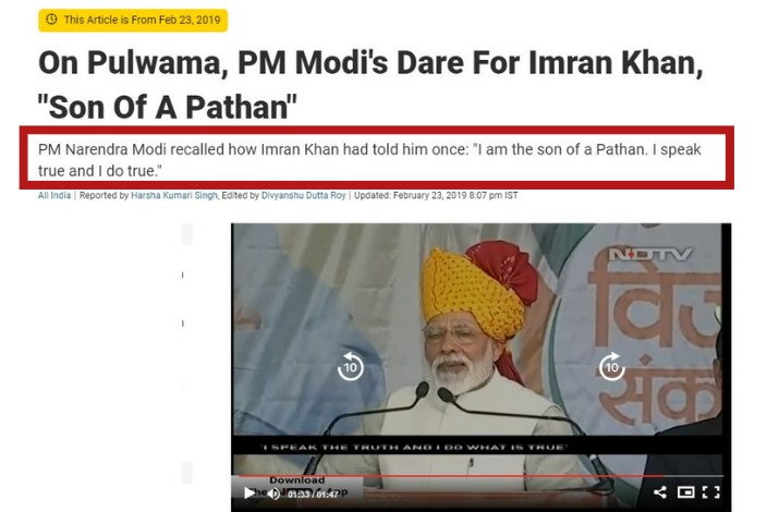 Carrying a longer version of the viral video, the report stated that PM Modi challenged Imran Khan (then Pakistan PM) to “to act honourably by bringing to justice those responsible for the Pulwama terror attack.” It further quoted the Prime Minister as saying, “I told him (Khan) there have been plenty of fights between India and Pakistan. Pakistan got nothing. Every time, we won. I told him let us fight against poverty and illiteracy. He (Khan) told me, ‘Modi ji, I am the son of a Pathan. I speak true and I do true‘. Today, the time has come for him to stand true to his words. I will see whether he stands true to his words or not,” he said.