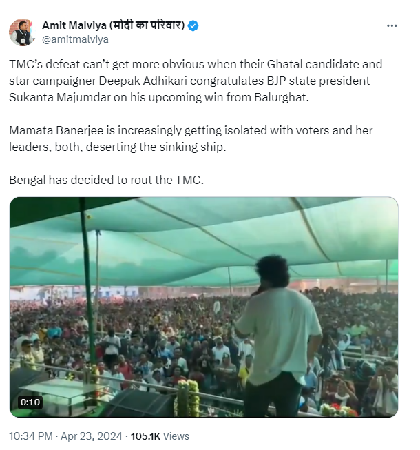 Bengali actor, TMC’s star campaigner and party candidate from Ghatal Deepak Adhikari (Dev) recently made a last-minute campaign visit to West Bengal’s Balurghat ahead of the upcoming second round of voting on April 26 and also held a rally in support of the TMC candidate at Kushmandi. Posting a 24-second video clip of that meeting on his X handle, BJP leader Amit Malviya alleged that TMC’s star campaigner Deepak Adhikari has already admitted the defeat of his party candidate before the polls, since he can be heard congratulating the BJP candidate from Balurghat Sukanta Majumdar even before the elections.