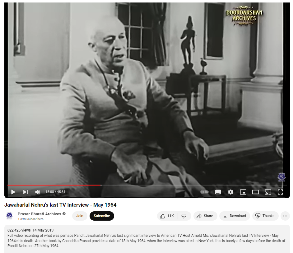 We found that the full interview was shared on the same YouTube channel in May 2019. The description of the same read, “Full video recording of what was perhaps Pandit Jawaharlal Nehru’s last significant interview to American TV Host Arnold Mich Jawaharlal Nehru’s last TV Interview – May 1964…Another book by Chandrika Prasad provides a date of 18th May 1964 when the interview was aired in New York, this is barely a few days before the death of Pandit Nehru on 27th May 1964.”