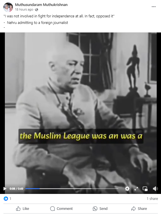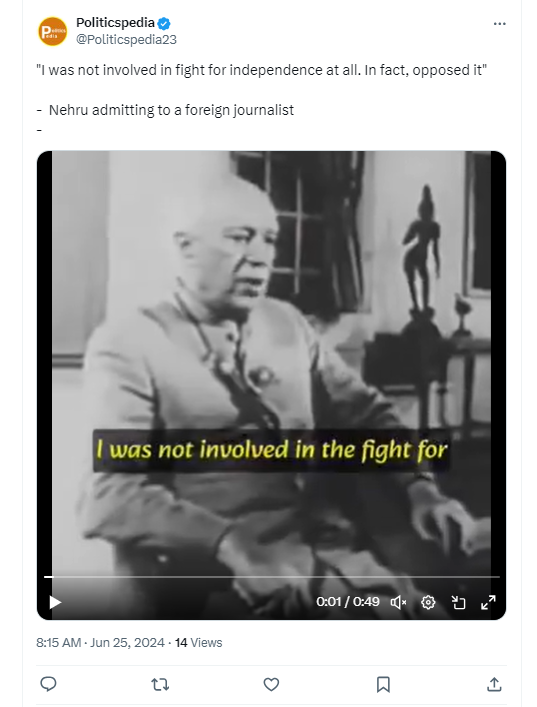 Multiple X, Facebook and Instagram users shared the 49-second-long-video claiming, ” “I was not involved in the fight for independence at all. In fact, opposed it” – Nehru admitting to a foreign journalist”