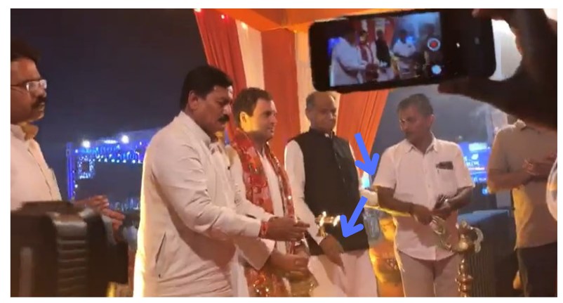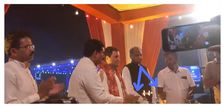 The post carried a 39-second-long video, which -on analysing – we could conclude was actually a shooter version of the clip posted by Patwari from a different angle. It starts when the ‘Aarti thali was with Gehlot. Around 33 seconds in the video, Gehlot can be clearly seen gesturing to a person standing next to him to take the Aarti thali from the man standing on Gandhi’s right, who then hands it over to the former. It can be clearly seen that at this point, the Aarti thali was not offered to Gandhi, but to another man standing next to Gehlot, discrediting the claim that the Congress leader had refused to do Aarti.