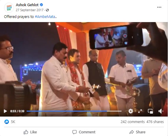 Further, we conducted Yandex reverse image search on the keyframes of the viral video which led us to a Facebook post by Ashok Gehlot, dated September 27, 2017, captioned “Offered prayers to #AmbeMata..”