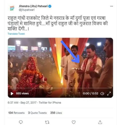 On analysing the viral video, we noticed the idol of Hindu Goddess Durga. Taking a clue, we conducted a keyword search for “Rahul Gandhi Durga Puja,” and “राहुल गांधी दुर्गा पूजा,” on Twitter which led us to a post by Congress leader Jitendra Patwari, dated September 27, 2017. The post carried a 52-second-long-video with a caption in Hindi which translates to “Rahul Gandhi attended maa Durga puja and garba pandals of Navratri in Rajkot district..maa durga will give power to Rahul ji to win Gujarat…”