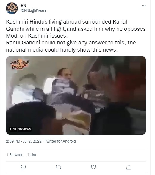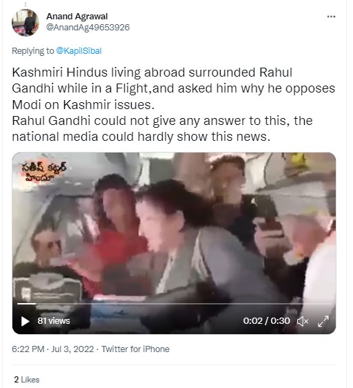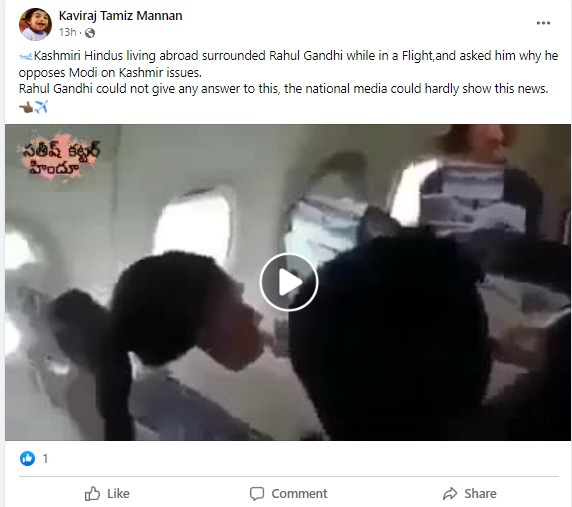 A video showing a seemingly distraught woman, flanked by several others, speaking to Rahul Gandhi inside an aircraft as the Congress leader is seen listening patiently, is going viral on social media platforms. Those sharing the video claim that the video showed “Kashmiri Hindus living abroad” gherao the Congress leader and asking him “why he opposes Modi on Kashmir issues.” Adding that Rahul Gandhi “could not give any answer to this, the national media could hardly show this news.” Newschecker found the claim to be untrue.