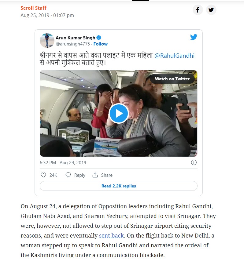 A Scroll.in report, dated August 25, 2019, stated, “On the flight back to New Delhi, a woman stepped up to speak to Rahul Gandhi and narrated the ordeal of the Kashmiris living under a communication blockade.”