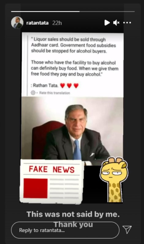 Newschecker Hindi Team, who debunked the claim last year, had taken the screengrab of Tata’s Instagram story clarifying that the viral statement has been falsely attributed to him.