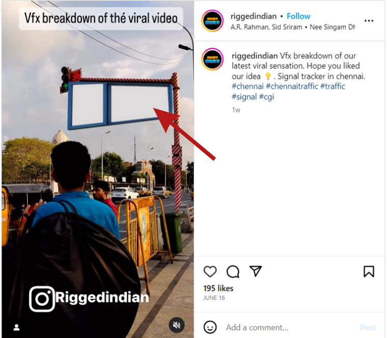 A keyword search for “Signal tracker,” and “Chennai” on Google did not yield any credible news reports on the alleged “new innovation.” However, it led us to an Instagram post by @riggedindian, dated May 2, 2022. It carried the viral footage with the caption, “Red signal tracker in chennai, if this comes then we can have a great traffic system. This is a VFX video not real #chennaibeach #chennai #signal #trafficsignal #blendervfx”