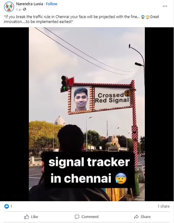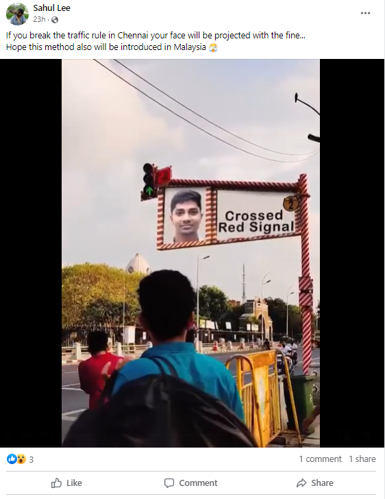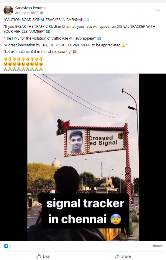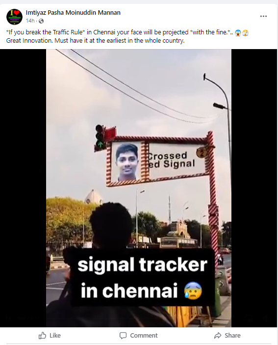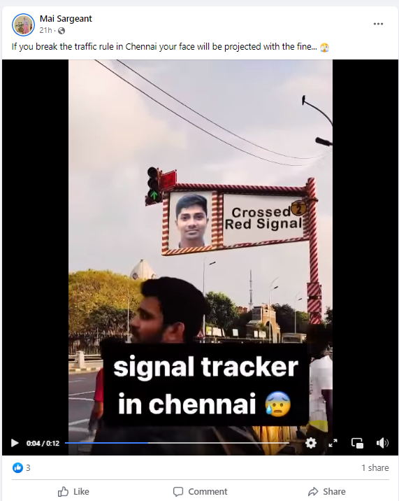 Multiple social media users shared the video claiming, “If you break the Traffic Rule in Chennai your face will be projected with the fine…”