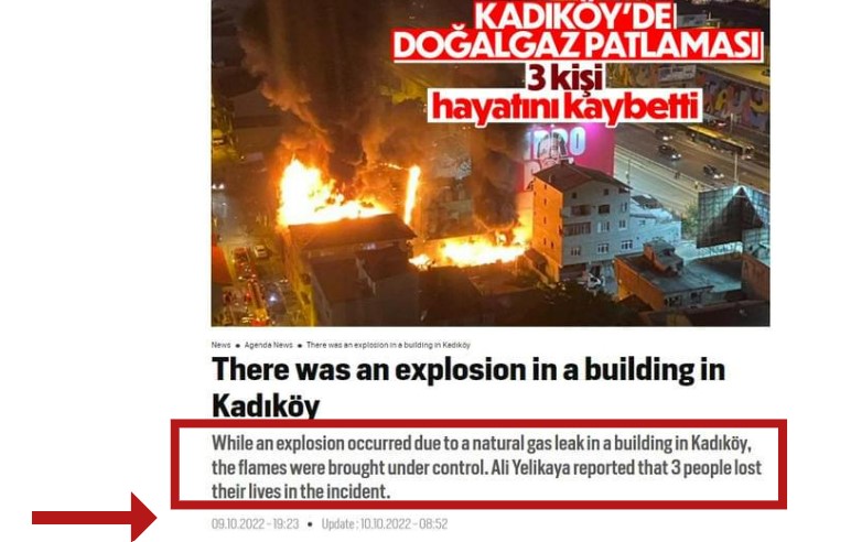In a report dated October 9, 2022, news outlet Rudaw stated, “It was reported that 3 people lost their lives in a natural gas explosion in a building in Kadıkoy, Istanbul. In Istanbul Kadıköy, the fire that broke out after the explosion in the building was brought under control by the firefighters. According to the information received, an explosion occurred in a building in Fikirtepe Mahallesi Erdemler Sokak. After the explosion, a fire broke out in the building.”