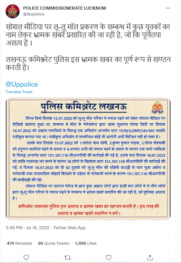 We found that the July 15 tweet by DCP South Lucknow was indeed posted in connection with these arrests. It is likely that the ambiguity over the said “religious activities”(dharmik kriyakalap) in the aforementioned tweet caused the confusion and misled social media users into deducing that three Hindus were arrested in connection with offering Namaz at LuLu Mall.