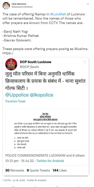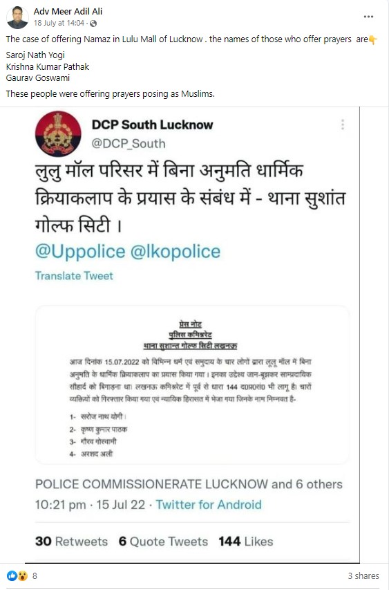 Sharing a screenshot of a tweet purportedly by DCP South Lucknow, dated July 15, 2022, some social media users alleged that three Hindu men posed as Muslims and offered Namaz at the mall’s premises. In the alleged tweet in Hindi, DCP South Lucknow informed about the arrest of four people- Saroj Nath Yogi, Krishna Kumar Pathak, Gaurav Goswami and Arshad Ali – over an attempt to indulge in religious activities at LuLu mall premises without permission.