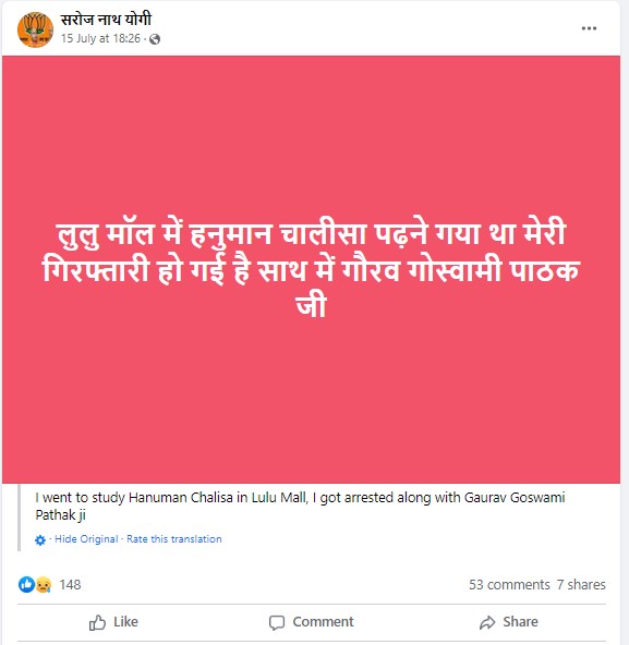 Further, we found a Facebook post by Saroj Nath Yogi, one of the persons named in the viral claim, dated July 15, 2022. The post in Hindi roughly translates to, “went to LuLu Mall to recite Hanuman Chalisa. I and Gaurav Goswami Pathak were arrested”.