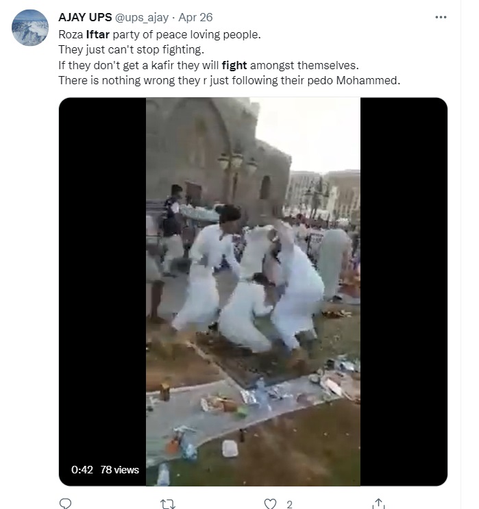 The video showing men fighting outside Medina’s Al-Ghamamah mosque in front of an Iftar spread three years ago has been shared in recent context on social media.