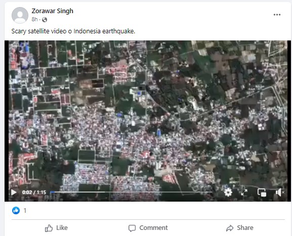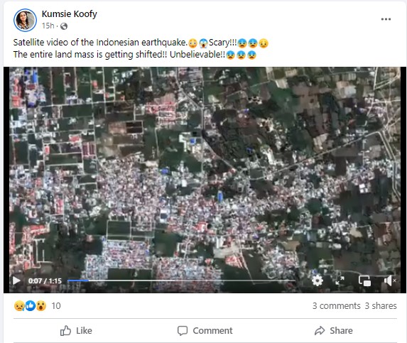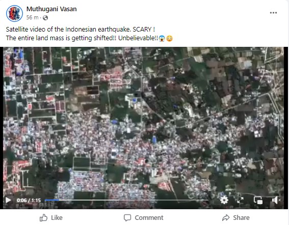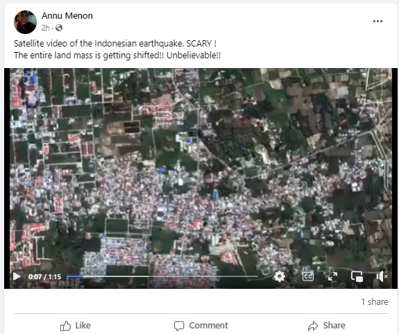 Several Twitter and Facebook users shared the one-minute-fifteen-second-long-video with a narrator explaining the “liquefaction” in Indonesia following the earthquake. The footage is widely shared with the caption, “Satellite video of the Indonesian earthquake. SCARY! The entire land mass is getting shifted!! Unbelievable!!”