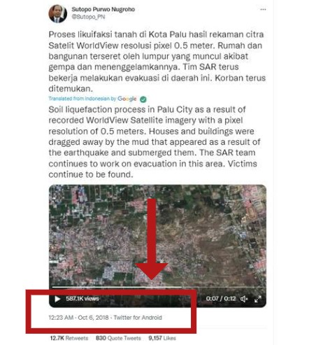 Additionally, we also found a tweet by the late spokesman for Indonesia’s disaster management agency, Sutopo Purwo Nugroho dated October 6, 2018. It carried the viral footage with a caption in Indonesian which roughly translates to, “Soil liquefaction process in Palu City as a result of recorded WorldView Satellite imagery with a pixel resolution of 0.5 metres. Houses and buildings were dragged away by the mud that appeared as a result of the earthquake and submerged them. The SAR team continues to work on evacuation in this area. Victims continue to be found.”