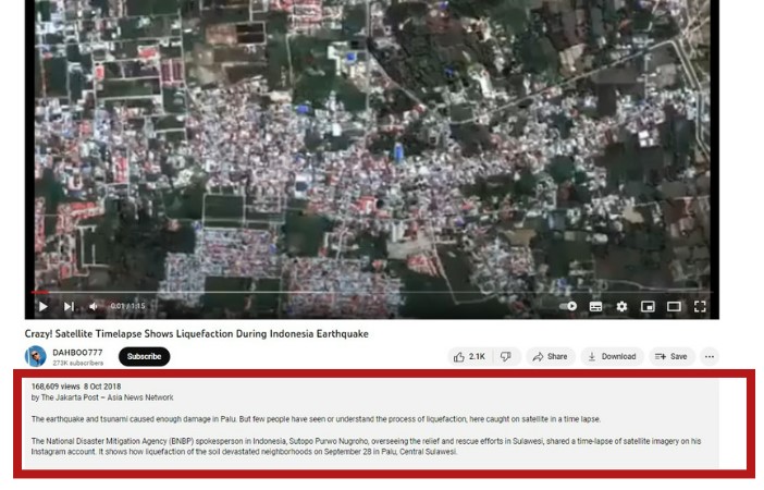 Furthermore, we heard “this is Dabho 7” in the voiceover in the beginning of the viral video. A keyword search for “Dabho 7, “Satellite, “Liquefaction, & “Indonesia” on YouTube threw up the full one-minute-fifteen-second-long video with the same voice over. Notably, the viral video was uploaded on YouTube channel of one ‘DAHBOO777’ on October 8, 2018 with the title ‘Crazy! Satellite Timelapse Shows Liquefaction During Indonesia Earthquake.’
