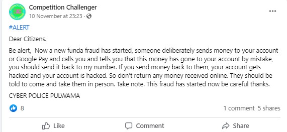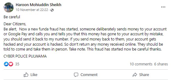 “Be alert, Now a new funda fraud has started, someone deliberately sends money to your account or Google Pay and calls you and tells you that this money has gone to your account by mistake, you should send it back to my number. If you send money back to them, your account gets hacked and your account is hacked. So don’t return any money received online. They should be told to come and take them in person. Take note. This fraud has started now be careful thanks. (sic)” the viral post reads.