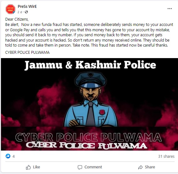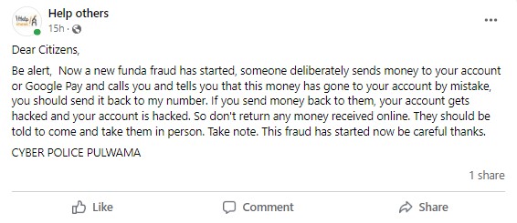 Newschecker reached out to the Pulwama Cyber Police on the matter, who informed us that their Facebook post, warning users against the new scam, was not limited to Google Pay. “It can be any online money transfer facility, not particularly Google Pay. The source (from where the hacker would transfer money) can be any,” we were informed, indicating that other users of other payment platforms could also fall for the same modus operandi.