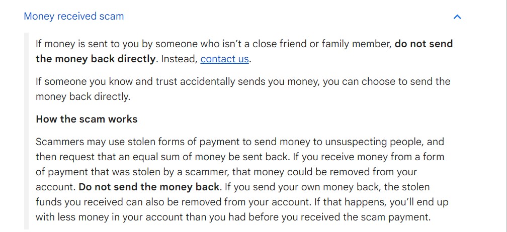 “If money is sent to you by someone who isn’t a close friend or family member, do not send the money back directly. Instead, contact us. If someone you know and trust accidentally sends you money, you can choose to send the money back directly,” the page informed.