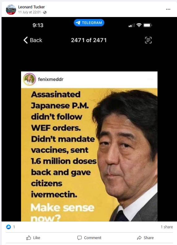 Several Twitter and Facebook users shared an image with the text, “Assassinated Japanese P.M. didn’t follow WEF orders. Didn’t mandate vaccines, sent 1.6 million doses back and gave citizens ivermectin. Make sense now.”