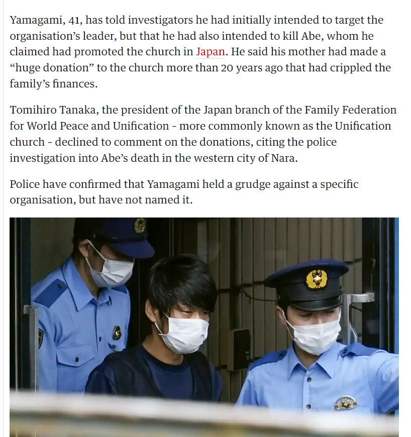 Further, we found a report by The Guardian, dated July 11, 2022, with the title “Shinzo Abe killing: ‘Moonies’ church confirms suspect’s mother is member.” As per the report, Tetsuya Yamagami (accused in Abe’s murder) told investigators that he had initially intended to target the organisation’s leader, but that he had also intended to kill Abe, whom he claimed had promoted the church in Japan. He said his mother had made a “huge donation” to the church more than 20 years ago that had crippled the family’s finances. The report added, “Police have confirmed that Yamagami held a grudge against a specific organisation, but have not named it.”