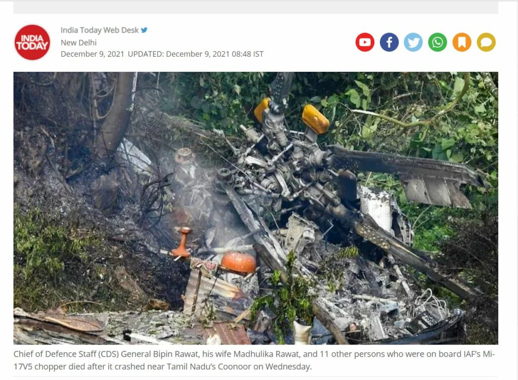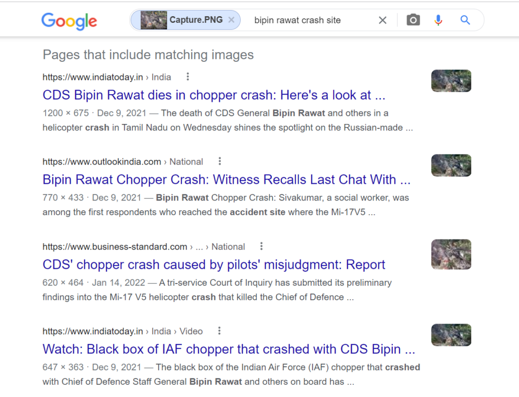 One of the articles published on the India Today website carried the image stating that the picture was clicked at the time of the chopper crash involving India Chief of Defence Staff General Bipin Rawat. General Rawat, his wife Madhulika Rawat, and 11 other persons who were on board the chopper died when it crashed near Tamil Nadu’s Coonoor in December 2021.