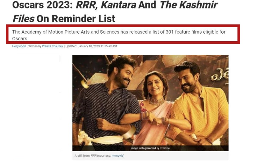 A Google search for “The Kashmir Files,” & “Oscar 2023” led us to a report by NDTV, dated January 10, 2023, titled ‘Oscars 2023: RRR, Kantara And The Kashmir Files On Reminder List.’ It stated, “The Academy of Motion Picture Arts and Sciences has released a list of 301 feature films eligible for Oscars and Indian films that have made the cut include SS Rajamouli’s RRR, Sanjay Leela Bhansali’s Gangubai Kathiawadi, Vivek Agnihotri’s The Kashmir Files and Rishab Shetty’s Kantara…”