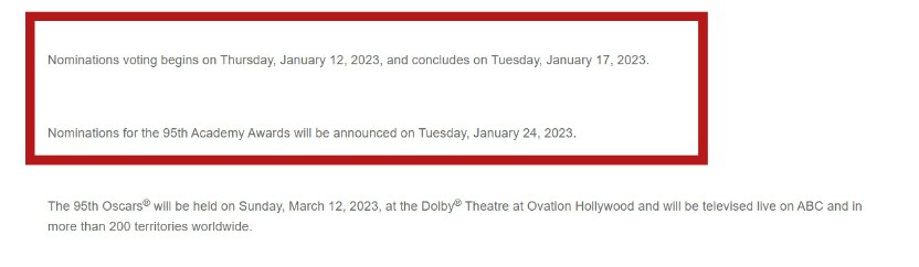 The release however stated, “Nominations voting begins on Thursday, January 12, 2023, and concludes on Tuesday, January 17, 2023. Nominations for the 95th Academy Awards will be announced on Tuesday, January 24, 2023.”