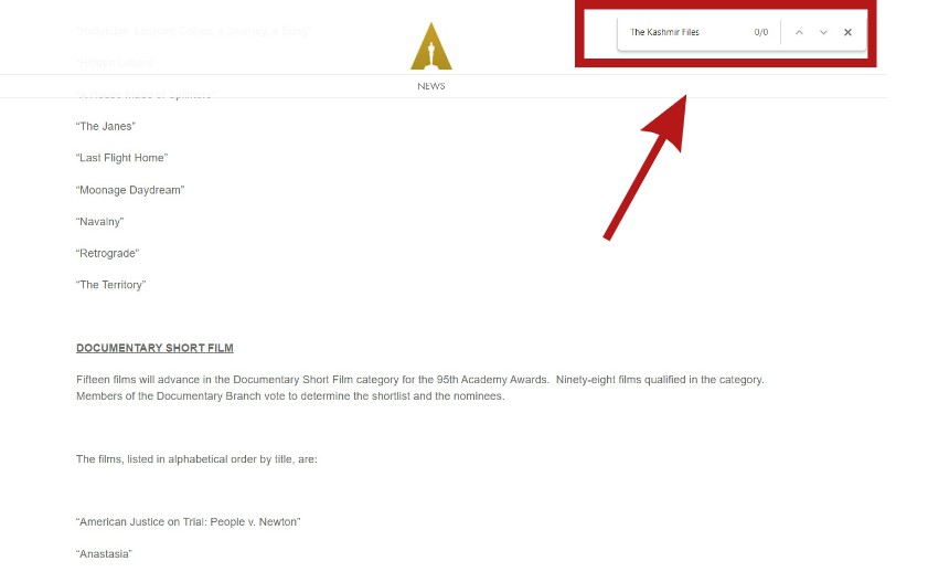 On scanning through the release we found the names of four Indian movies enlisted- The Elephant Whisperers, Last Film Show, RRR and All That Breathes- but could not spot we ‘The Kashmir Files.’ A keyword search for Agnihotri’s movie on the webpage did not throw up any result as well.