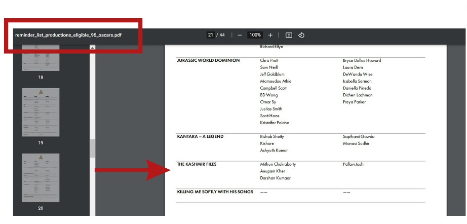 On inspecting the link, we were directed to a PDF listing film titles and names of actor/actress “eligible for the 95th Academy Awards. (Oscars 2023).” Notably, the list featured The Kashmir Files, in addition to other (more than 5) Indian movies including Iravin Nizhal, Vikrant Rona, All That Breathes, Kantara, and Gangubai Kathiawadi.