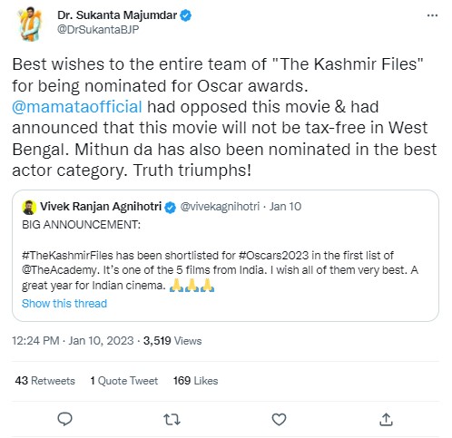 Soon after Agnihotri’s “Big announcement,” social media platforms were flooded with congratulatory messages for The Kashmir Files team. Some users, including the State President of BJP Bengal, Dr. Sukanta Majumdar, went a step ahead and hailed the movie for getting “nominated” for the Oscars.