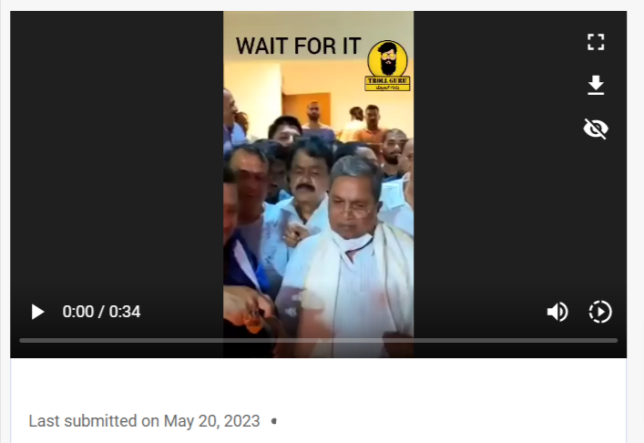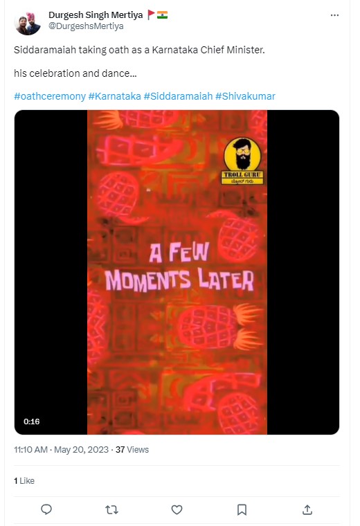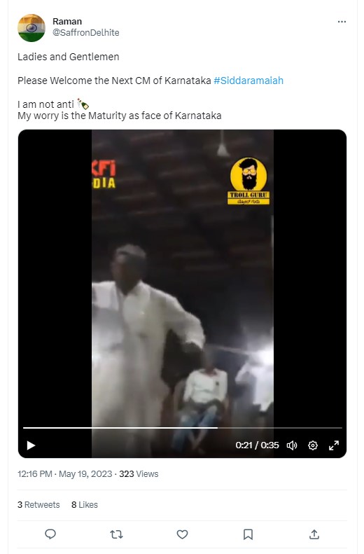 A video purportedly showing Karnataka Chief Minister Siddaramaiah dancing allegedly after having Champagne is going viral on social media platforms. In the 34-second-long-video, two footage have been switched together. While the first part shows the Congress leader celebrating with a Champagne bottle, the second segment allegedly shows Siddaramaiah dancing. The text “a few moments later” has been used to join the two clips together- insinuating that the new Karnataka Chief Minister was dancing under the influence of alcohol. The video further carries a watermark of “Troll Guru”.