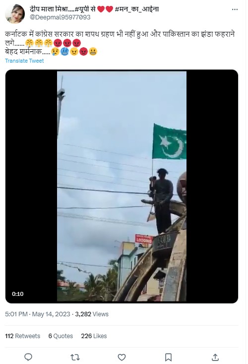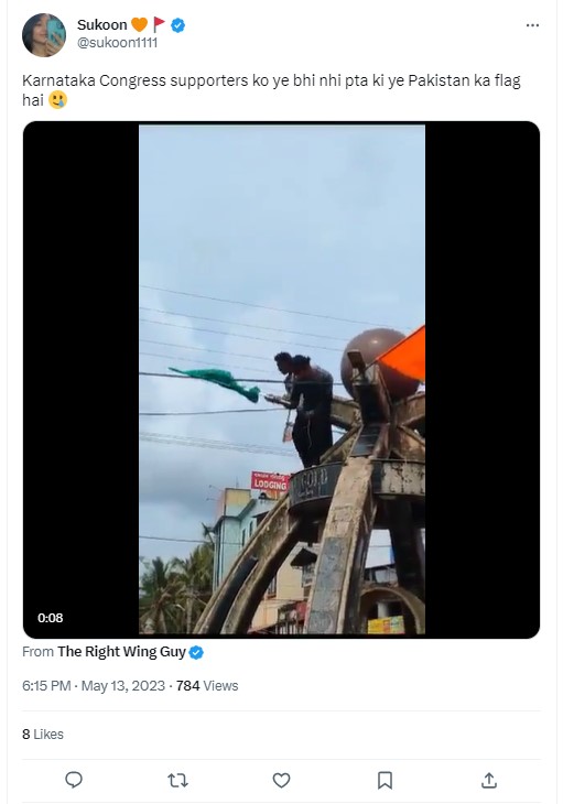 A video showing a man waving a green flag with a white crescent moon and star is being widely shared online. Those sharing the video alleged that the man seen in the viral clip was waving a Pakistani flag following Congress’ win in Karnataka. They further claimed it to be an outcome to electing the Congress in the state polls. Newschecker found the claim to be untrue. Though the video is from a celebration of a Congress’ candidate victory in Karnataka, it does not show the man waving a Pakistani flag.