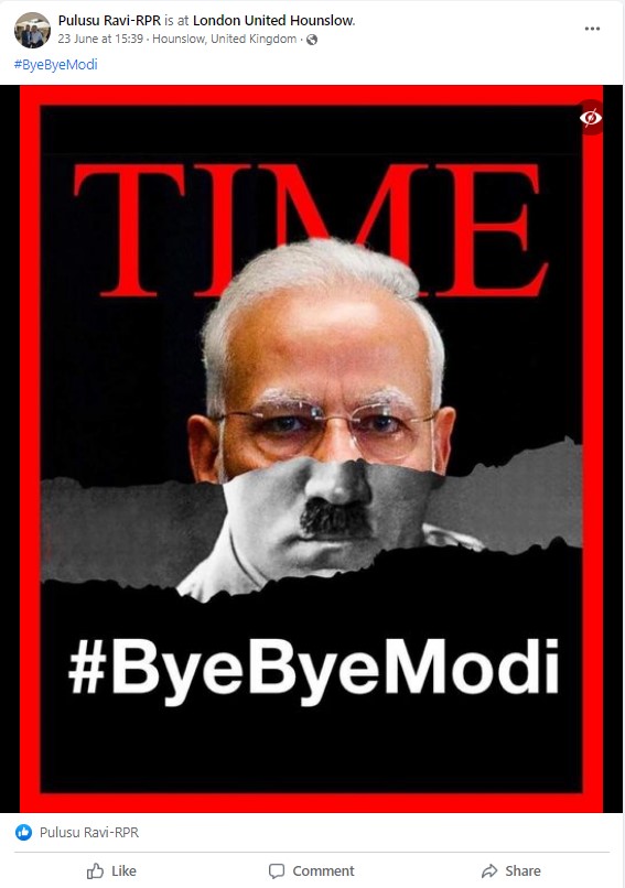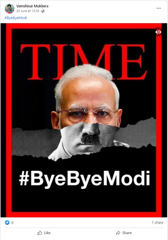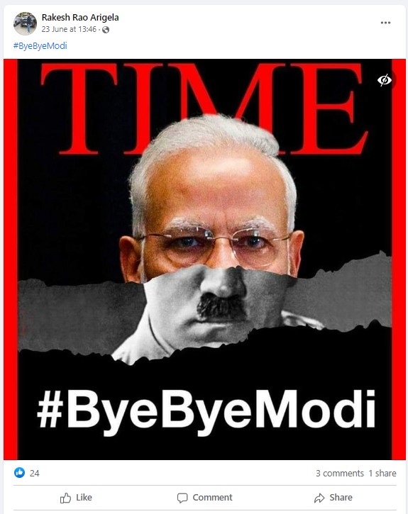 As the trend “#byebyemodi” gained momentum on social media, several social media users shared an image purportedly showing a TIME magazine cover featuring PM Modi with a moustache of late-German dictator Adolf Hitler overlaid on his face. The words “#byebyemodi” can also be seen superimposed on the image. Newschecker found the image to be fabricated.