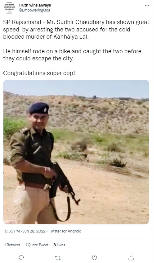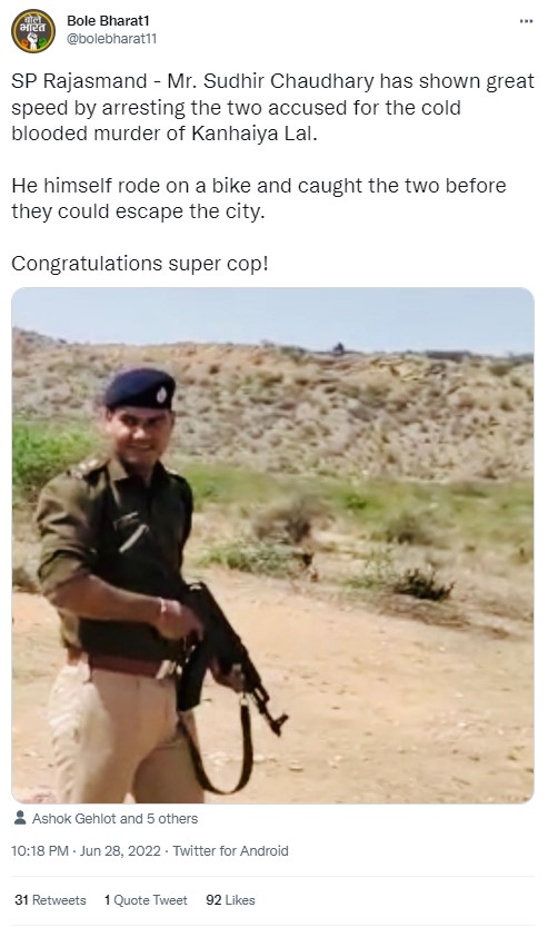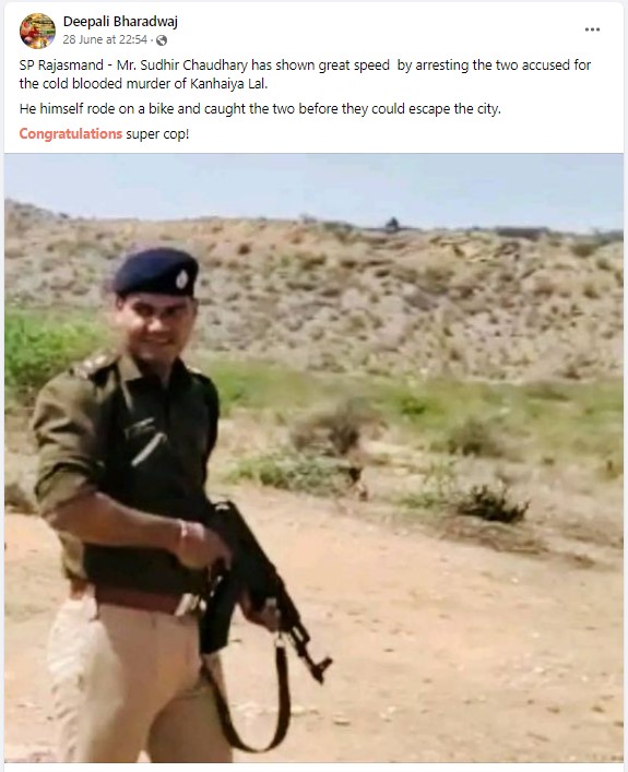 Following the arrest of accused in the connection to the gruesome murder of Udaipur tailor Kanhaiya Lal last week, several social media users shared a post claiming that Rajsamand SP “Sudhir Chaudhary himself rode on a bike and caught the two before they could escape the city.” They also lauded the “super cop” who showed “great speed by arresting the two accused for the cold blooded murder of Kanhaiya Lal.” Newschecker found the claim to be untrue.