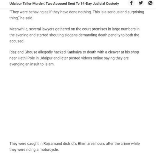The report also carried a video byte of ADG Law and Order Hawa Singh Ghumaria in which he can be heard saying, “They went to the tailor’s shop, gave measurement and then killed him. After the murder they left the place on a bike and moved towards the Rajsamand road.. But soon, it was known which bike they were on…. So a team started following them while the Rajsamand SP put blockades and the Rajsamand team arrested the duo from the Bhim area.”