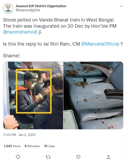 The post stated (translated from Bengali), “Purulia Express and Bande Bharat Express were attacked on the same day in West Bengal, stones were pelted. Who are these stone pelters? Who wants to destroy the country’s property? Those who do this don’t want the good of West Bengal, they even want the loss of the country.”
