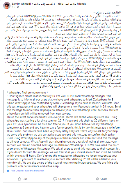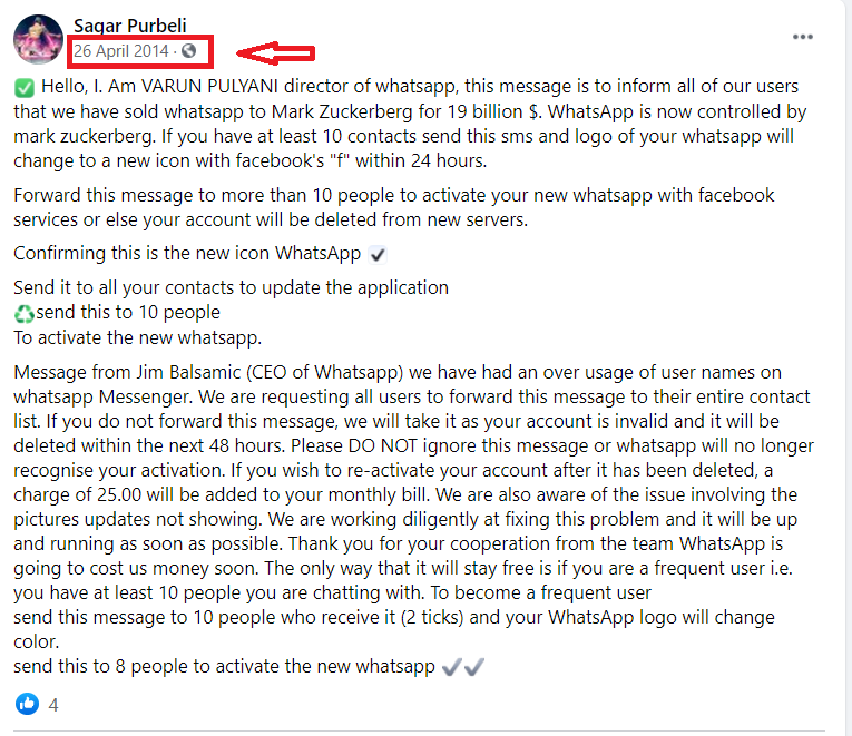 “Forward this message to more than 10 people to activate your new WhatsApp with Facebook services or your account will be deleted from the new servers,” the post claims.