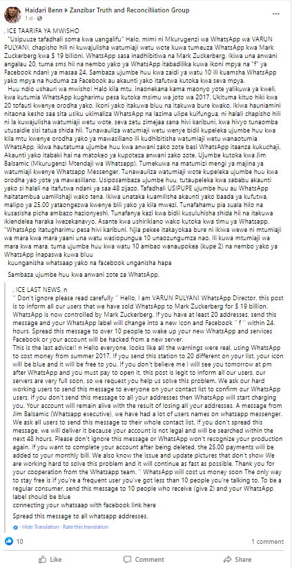 The message is also being shared in various foreign languages including Persian, French, and Swahili on Facebook.