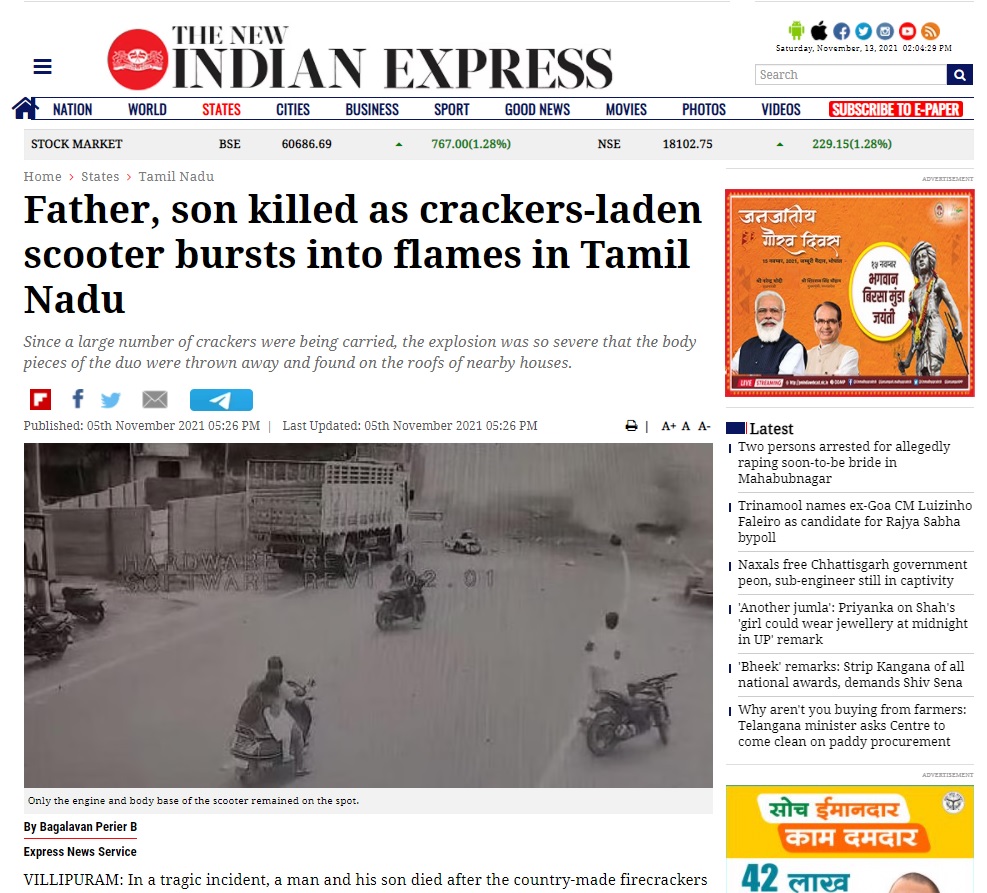 According to the report, the explosion happened in Kottakuppam, in Tamil Nadu’s Villupuram during Diwali this year, when a 36-year-old man and his 7-year-old son were carrying country-made firecrackers on their two-wheeler, killing them both.