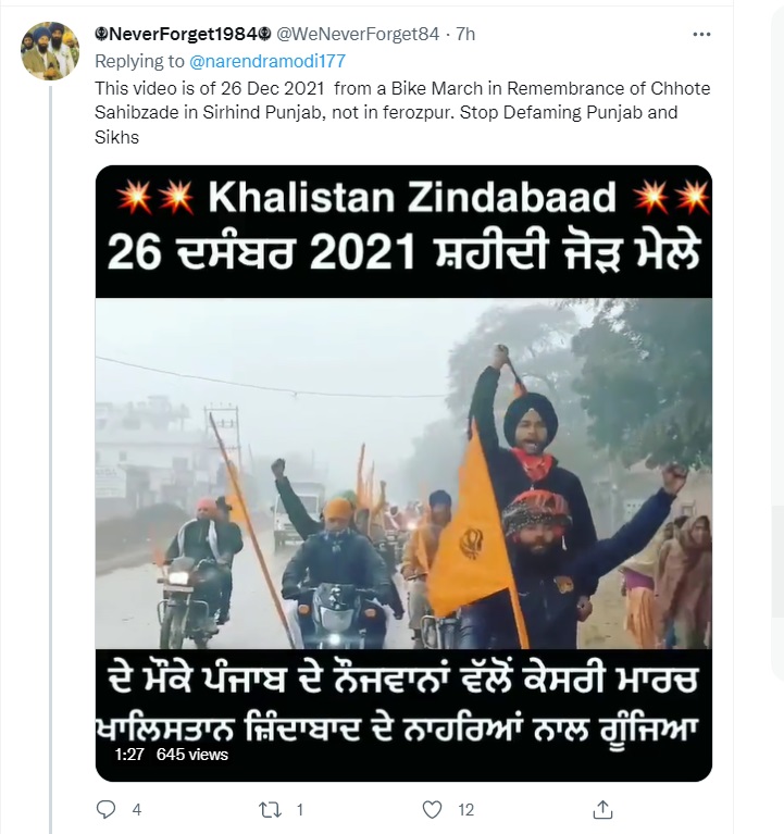 We also found the same video uploaded on Facebook on December 27. The caption of the video said ‘While CM Channi Paid Obeisance At Gurdwara Fatehgarb Sahib – Punjab Youth Took “Kesari March” In Memory of Sahibzadas and raised Khalistan Zindabad Slogans.’ This further confirms that the video being shared is at least two weeks old and was not from amidst Prime Minister’s visit to the state. However, Newschecker could not authenticate if the video was indeed from December 26 or if it was from an earlier instance from a different location.