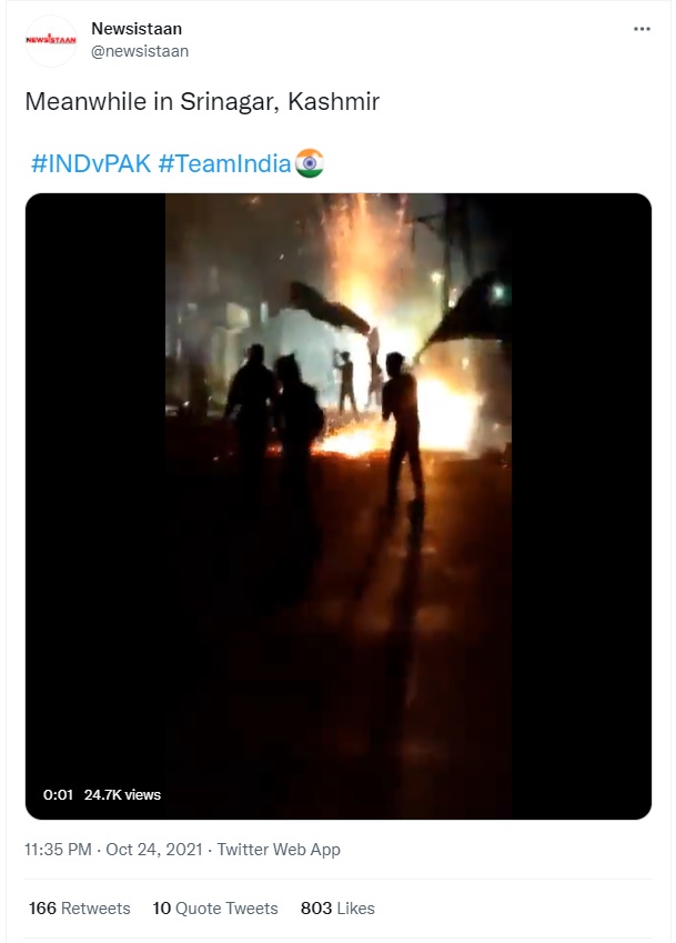 New Delhi: A video, allegedly from Srinagar, showing young men setting off fireworks in a dark alleyway, cheering and waving Pakistan’s flags after the recent Ind Vs Pak T20 WC match has gone viral on social media. Several verified handles on Twitter, from both within India and abroad, shared the video claiming to be celebrations in Srinagar. A fact check by Newschecker has found the video to be from 2020.