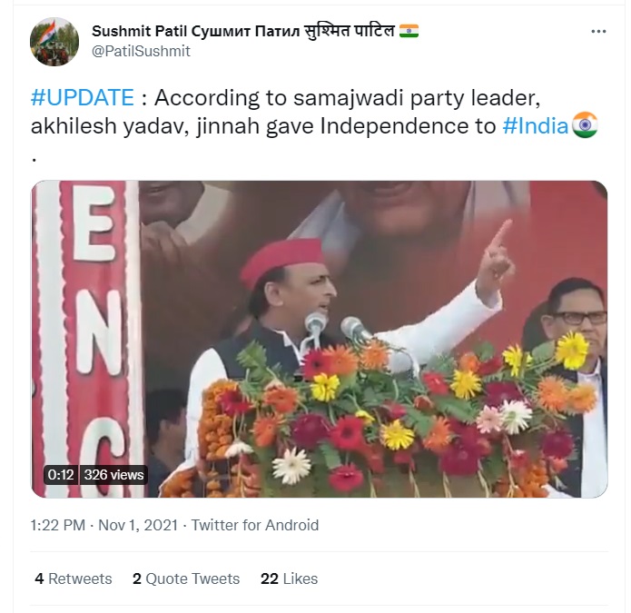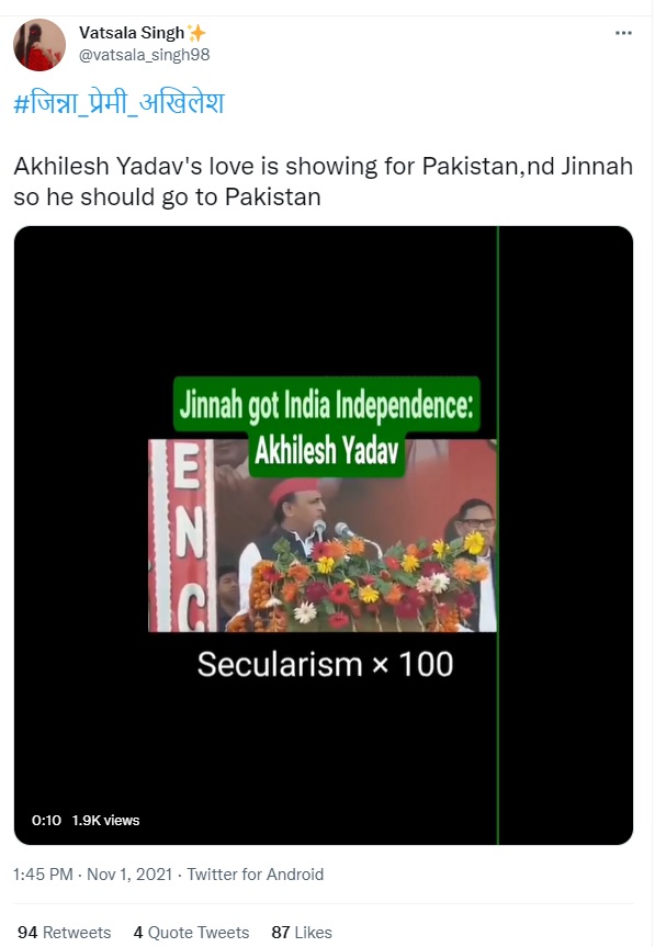 The viral video of Akhilesh Yadav saying ‘Jinnah Got Us Azadi’ has been tweeted out without context.