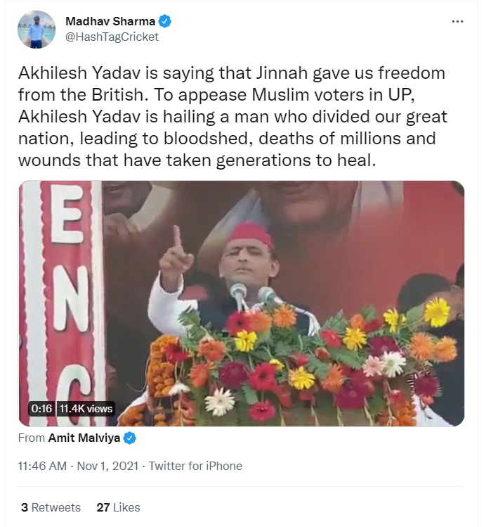 While Kanchan Gupta wrote “Jinnah Got us Azadi- Akhilesh Yadav. What kind of pandering is this?”, Pudur wrote “Jinnah ne Azadi Dilayi- Akhilesh Yadav. This one reason is enough to ensure he & his party which killed Ram sevaks are made to lose deposit the coming elections.”