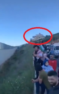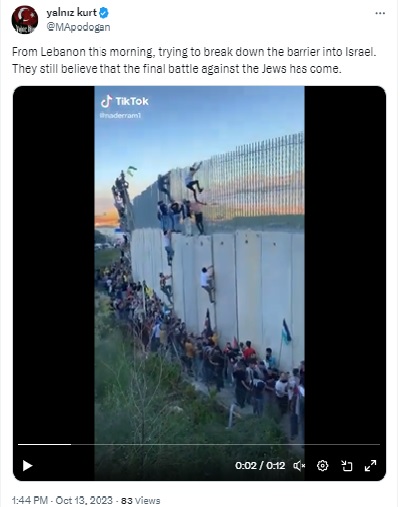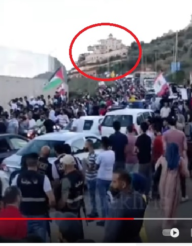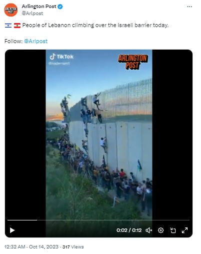 The photograph shows people climbing the wall with the large building in the background, as seen in the viral clip (left) and the Youtube video (right). Another Reuters photograph on the same date and showing the same location states, “Demonstrators climb a border wall during a protest to express solidarity with the Palestinian people, in Adaisseh village near the Lebanese-Israeli border, southern Lebanon.”