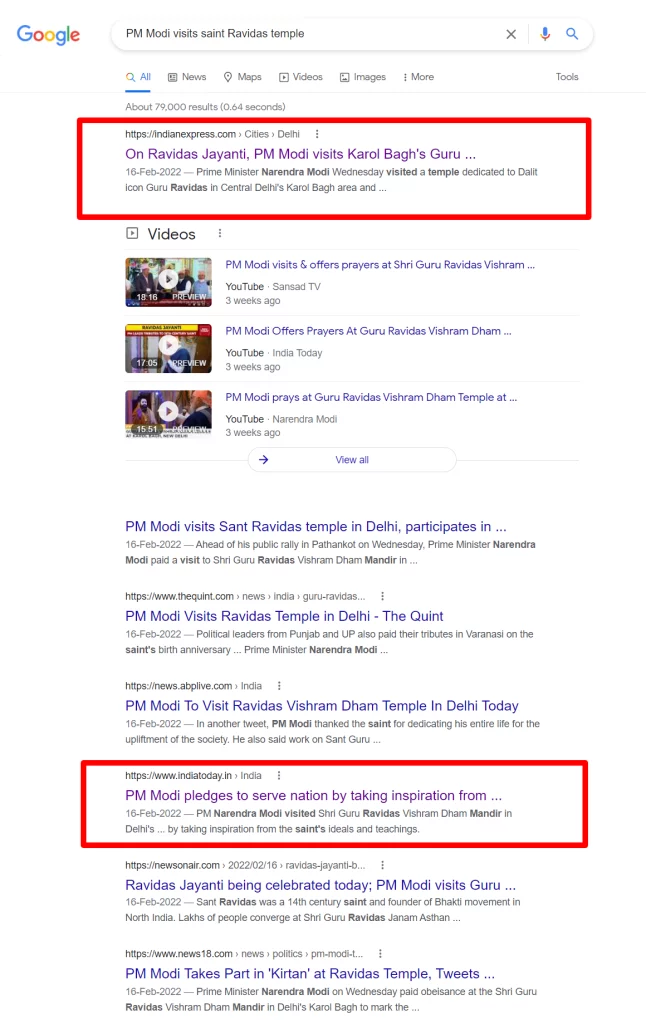 To verify the authenticity of the video, Newschecker conducted a reverse image search of the key-frames of the video on Google and found that this video was from his recent visit to the Sant Ravidas Temple in Delhi’s Karol Bagh. For more information about the video, we did a Google search using the keywords ‘PM Modi visits saint Ravidas temple’ and found media reports about the event that Prime Minister Narendra Modi attended.
